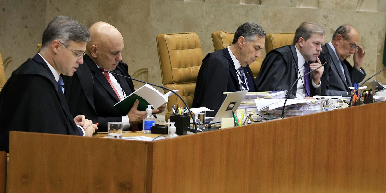O ministro Luís Roberto Barroso (ao centro), do Supremo Tribunal Federal (STF), ampliou o placar contra o marco temporal para demarcação de terras indígenas. Na sessão desta tarde, Barroso proferiu o quarto voto contra o marco. Com o posicionamento do ministro, o placar do julgamento está em 4 votos a 2 contra a tese.