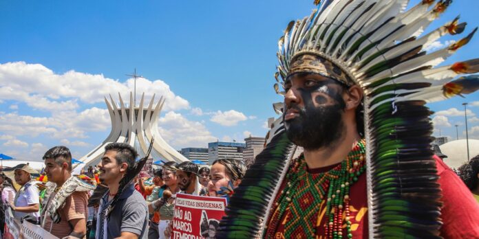 Para acompanhar o julgamento no STF, indígenas estão mobilizados em Brasília. Eles também se manifestam contra a tentativa do Senado de legalizar o marco temporal.