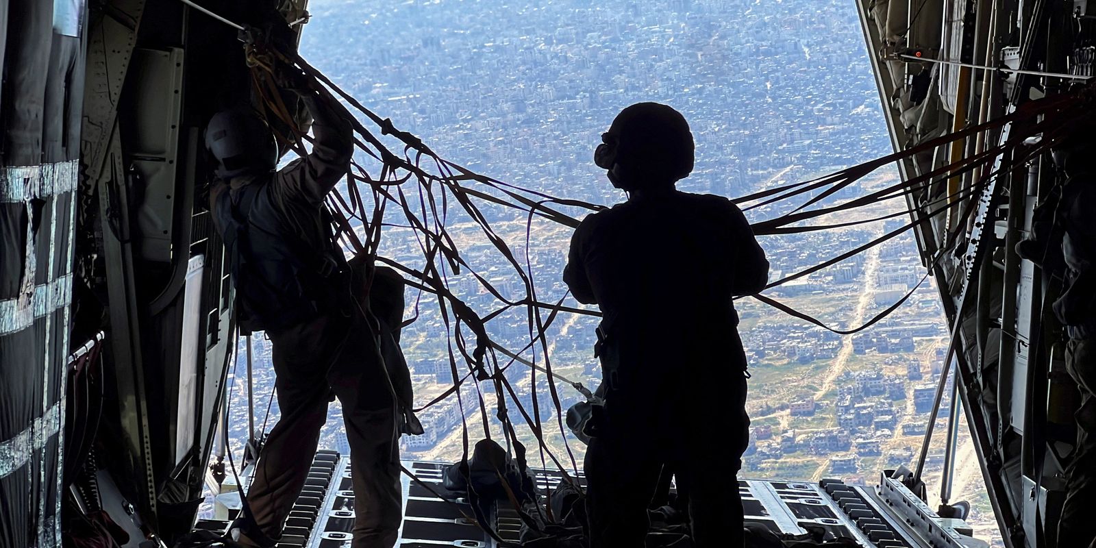 O avião desceu a cerca de 900 metros sobre o Mar Mediterrâneo e o norte de Gaza. A tripulação cortou as cordas dos paletes de ajuda embalados na Jordânia e liberou uma dúzia de grandes pacotes com paraquedas das portas traseiras abertas do C-130.