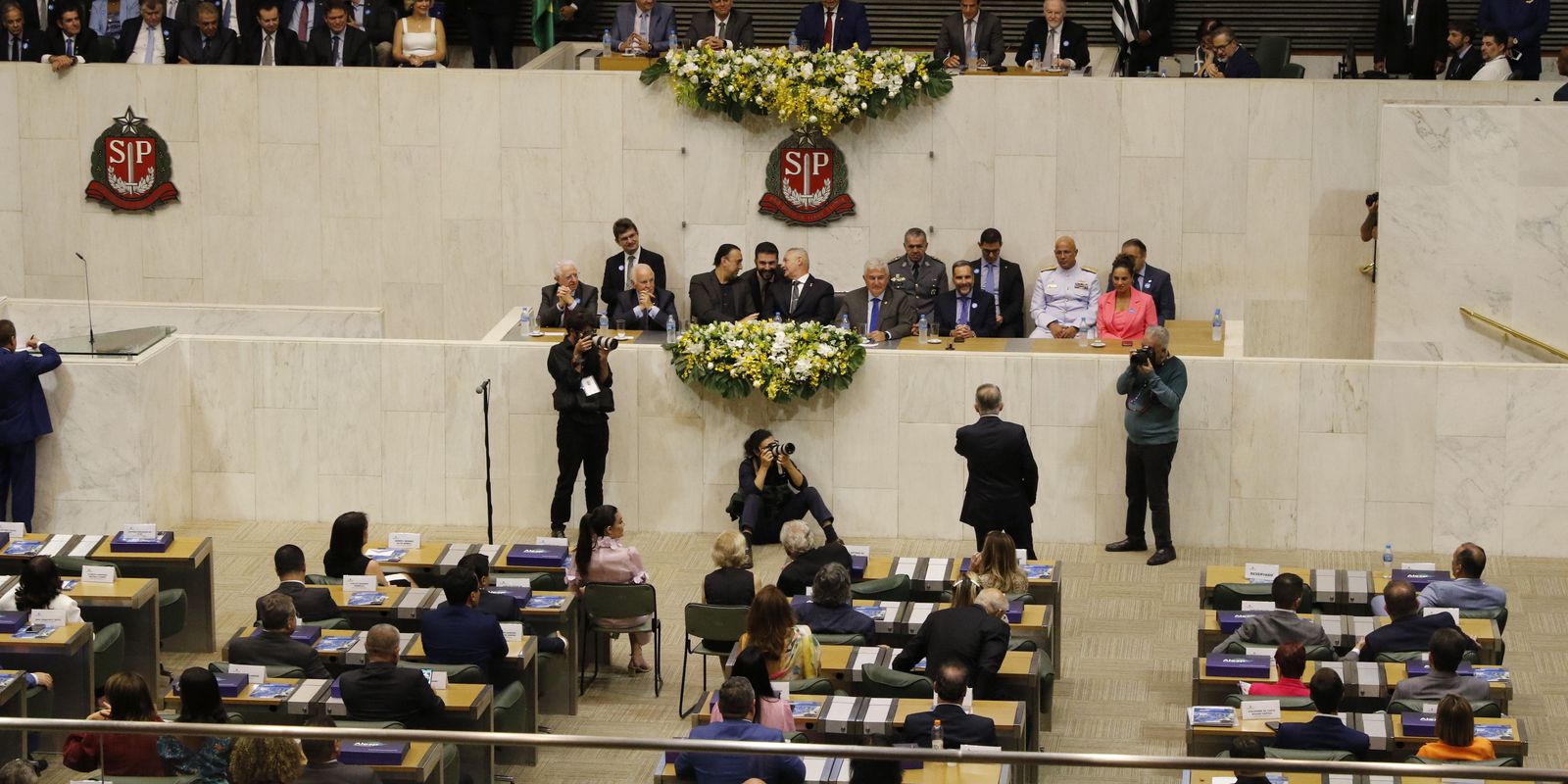 A cerimônia de posse dos deputados, realizada na tarde de hoje, em uma Alesp lotada, contou com a presença do governador Tarcísio de Freitas. Na solenidade, ele entregou à Alesp a síntese de uma mensagem apresentando a situação do estado de São Paulo, incluindo o cenário das contas públicas e os programas executados.