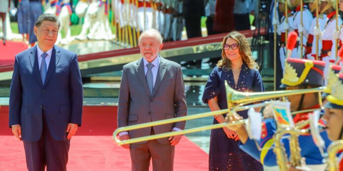 Recebido com honras militares, Xi Jinping passou em revista as tropas e acompanhou, ao lado do presidente Lula, uma formatura (desfile de tropas) do 1º Regimento de Cavalaria de Guardas, do Exército Brasileiro, conhecido como Dragões da Independência.