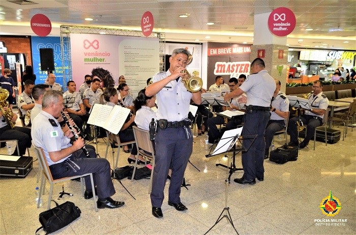 A Banda Sinfônica da PMDF abriu nesta segunda-feira, dia 07 de março, a programação do evento alusivo ao Dia Internacional da Mulher, denominado “Venâncio Mulher”. A Banda Sinfônica realizou a apresentação na praça de alimentação do shopping Venâncio 2000 sob a regência do 1º Tenente Roberto Cardoso.