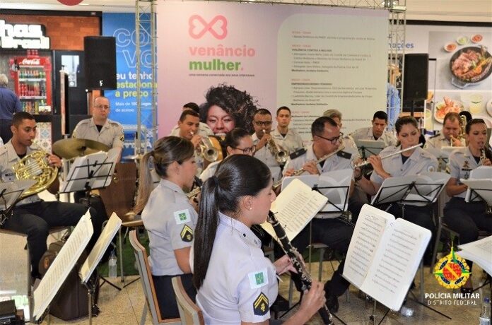 A Banda Sinfônica da PMDF abriu nesta segunda-feira, dia 07 de março, a programação do evento alusivo ao Dia Internacional da Mulher, denominado “Venâncio Mulher”. A Banda Sinfônica realizou a apresentação na praça de alimentação do shopping Venâncio 2000 sob a regência do 1º Tenente Roberto Cardoso.