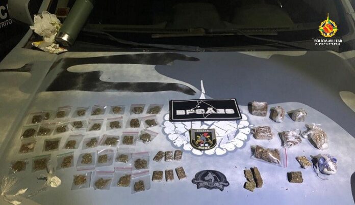 A cadela Shadow, do Batalhão de Policiamento com Cães, farejou os entorpecentes na vegetação e no meio-fio. Os policiais encontraram 53 porções de maconha e três de cocaína.