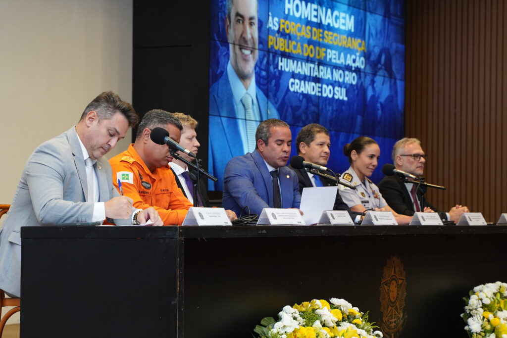 Na tarde desta segunda-feira (8), a Câmara dos Deputados promoveu uma cerimônia no auditório Nereu Ramos para homenagear os policiais militares do Distrito Federal que participaram de operações humanitárias no estado do Rio Grande do Sul. Na ocasião, os agentes das forças de segurança do DF foram agraciados com uma Moção de Aplauso em reconhecimento aos serviços prestados durante o desastre natural que afetou a região.