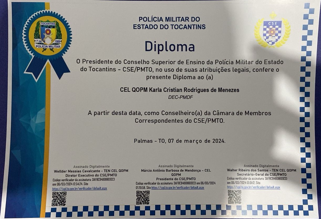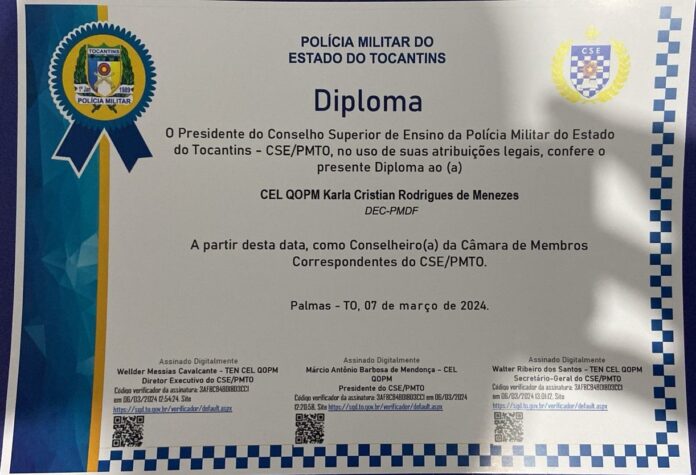A coronel da PMDF foi diplomada como Conselheira da Câmara de Membros Correspondentes do CSE/PMTO.