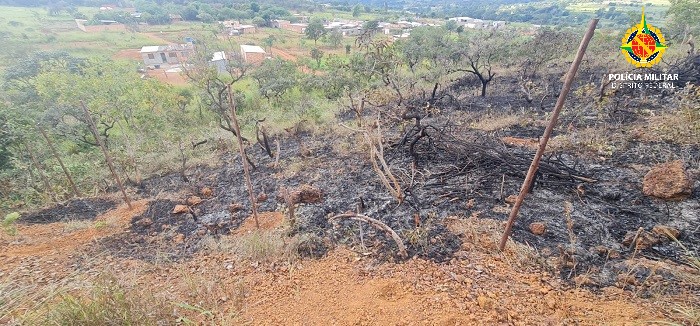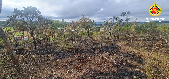 Integrantes do Batalhão de Polícia Militar Ambiental (BPMA) e do Grupamento de Operações no Cerrado (GOC) visualizaram uma área próxima à DF-473, que havia sofrido ação de supressão de vegetação nativa, emprego de fogo e apresentava demarcações com piquetes e estacas.