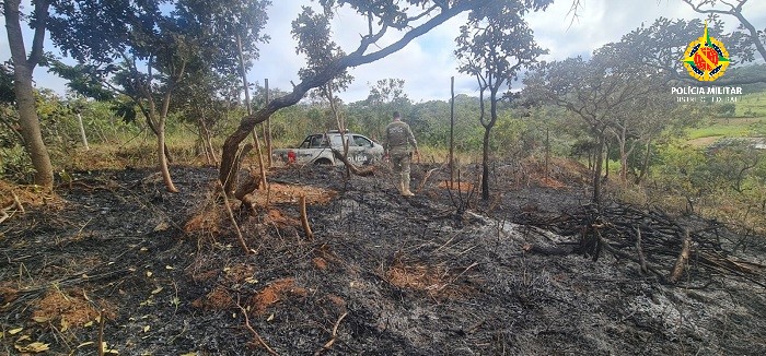 Integrantes do Batalhão de Polícia Militar Ambiental (BPMA) e do Grupamento de Operações no Cerrado (GOC) visualizaram uma área próxima à DF-473, que havia sofrido ação de supressão de vegetação nativa, emprego de fogo e apresentava demarcações com piquetes e estacas.