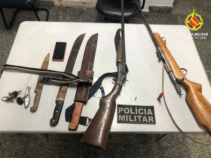 A equipe avistou um veículo suspeito na DF 250, Núcleo Rural Fazenda Velha, área rural do Paranoá-DF. Ao realizarem a abordagem, foram localizadas duas armas de fogo no interior do veículo, sendo uma espingarda calibre .22 e outra espingarda calibre .28, cada uma com uma munição intacta. Facas e outros petrechos próprios de caçadores também foram apreendidos.