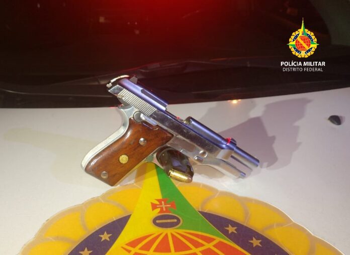Policiais Militares do 2º Batalhão patrulhavam o centro de Taguatinga quando viram um carro na contramão na CNB 12. O veículo foi interceptado e abordado. Ao revistarem os ocupantes, foi encontrado uma pistola calibre 380 com 10 munições na cintura do passageiro. No interior do carro foi localizado um frasco com substância conhecida como lança perfume.