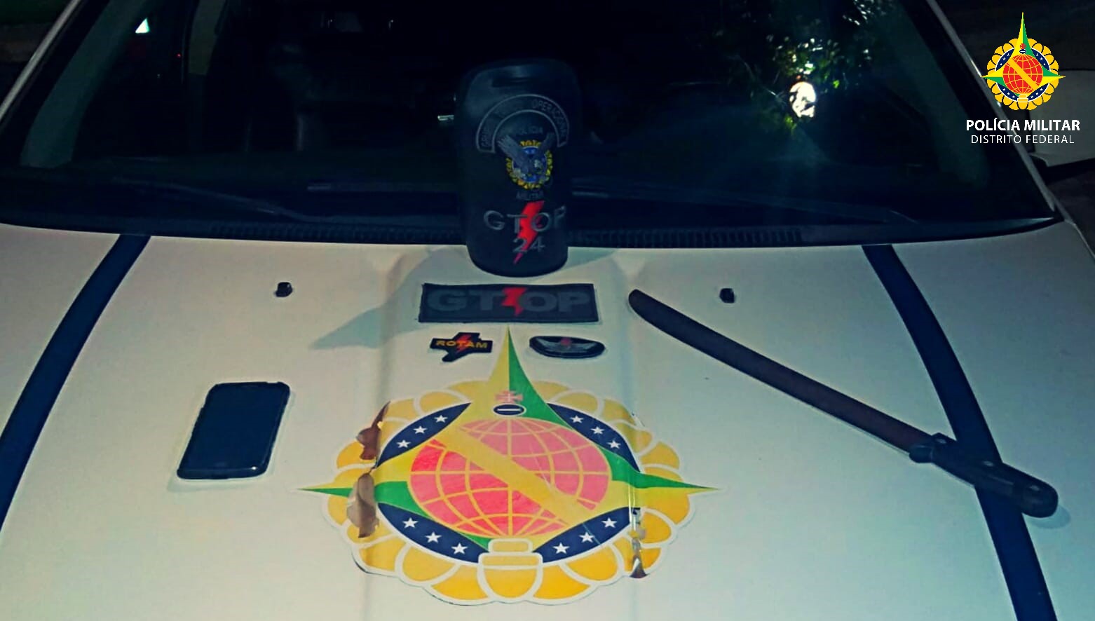 Os suspeitos foram encontrados na QE 34. Eles se recusaram a ser abordados pelo Gtop 24, um deles inclusive tentou atacar com um facão os policiais, o outro portava o celular roubado. Durante a abordagem a dupla xingava os policiais.
