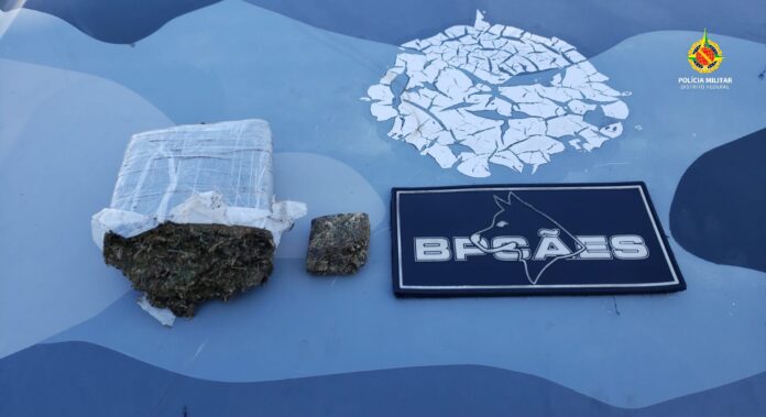 Durante treinamento do filhote K9 Ipa, na área conhecida como Curral na QS6, a equipe viu o momento em que dois homens correram ao ver a viatura. Foi realizada varredura sendo encontradas grandes porções de maconha.