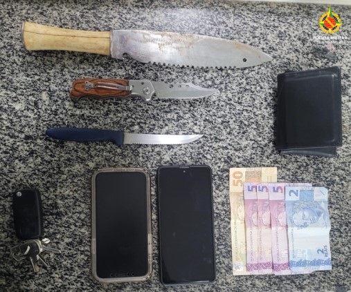 Dentro do veículo, os policiais encontraram dois canivetes, uma faca e um aparelho celular.