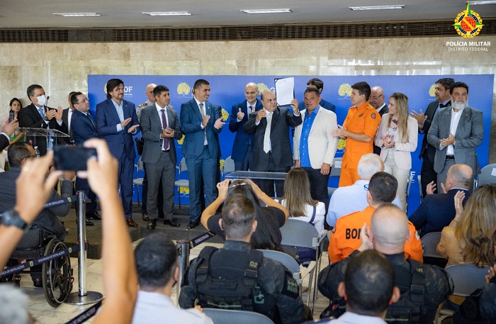O Governador do Distrito Federal, Ibaneis Rocha, assinou na manhã desta terça-feira, dia 15 de março, no Salão Branco do Palácio do Buriti, a proposta de recomposição salarial das forças de segurança pública do Distrito Federal. Durante a sua fala, elogiou o desempenho das forças de segurança, principalmente durante o período da pandemia, quando não houve interrupção dos serviços, mesmo nos momentos mais críticos. Ele ainda avaliou que a proposta de remuneração ainda não é a ideal e se comprometeu a continuar a trabalhar junto em prol das forças de segurança, sempre pensando numa melhor remuneração.