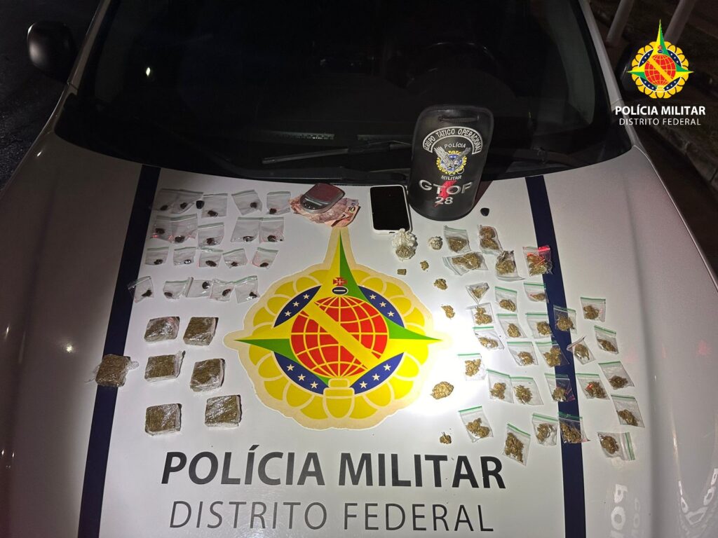 Com o indivíduo, foram encontradas diversas porções de maconha, haxixe e skunk, além de uma balança de precisão e R$ 30,00 em espécie. O material apreendido e o detido foram encaminhados à 15ª Delegacia de Polícia da Ceilândia para registro da ocorrência.