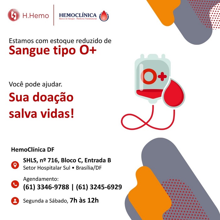 O Banco de Sangue Hemoclínica, necessita de doadores de sangue do Tipo O+. A sua doação salva vidas e você pode ajudar comparecendo a Hemoclínica, localizada na SHLS nº 716 Bloco C, entrada B (Setor Hospitalar Sul). O agendamento pode ser feito pelo telefone 3346-9788 ou 3245-6929. O horário de doação é de segunda a sábado, de 7h às 12h.