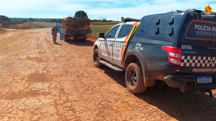 Policiais militares do Grupamento de Operações do Cerrado (GOC) apreenderam um caminhão carregado de madeira, às 14h deste sábado (25), em Planaltina.