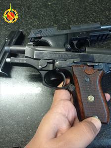 O trio foi abordado e na cintura do motorista os policiais encontraram uma pistola calibre 765. Dentro do carro foi encontrada a pistola calibre 22, com 10 munições intactas. Nada foi localizado com os outros dois suspeitos.
