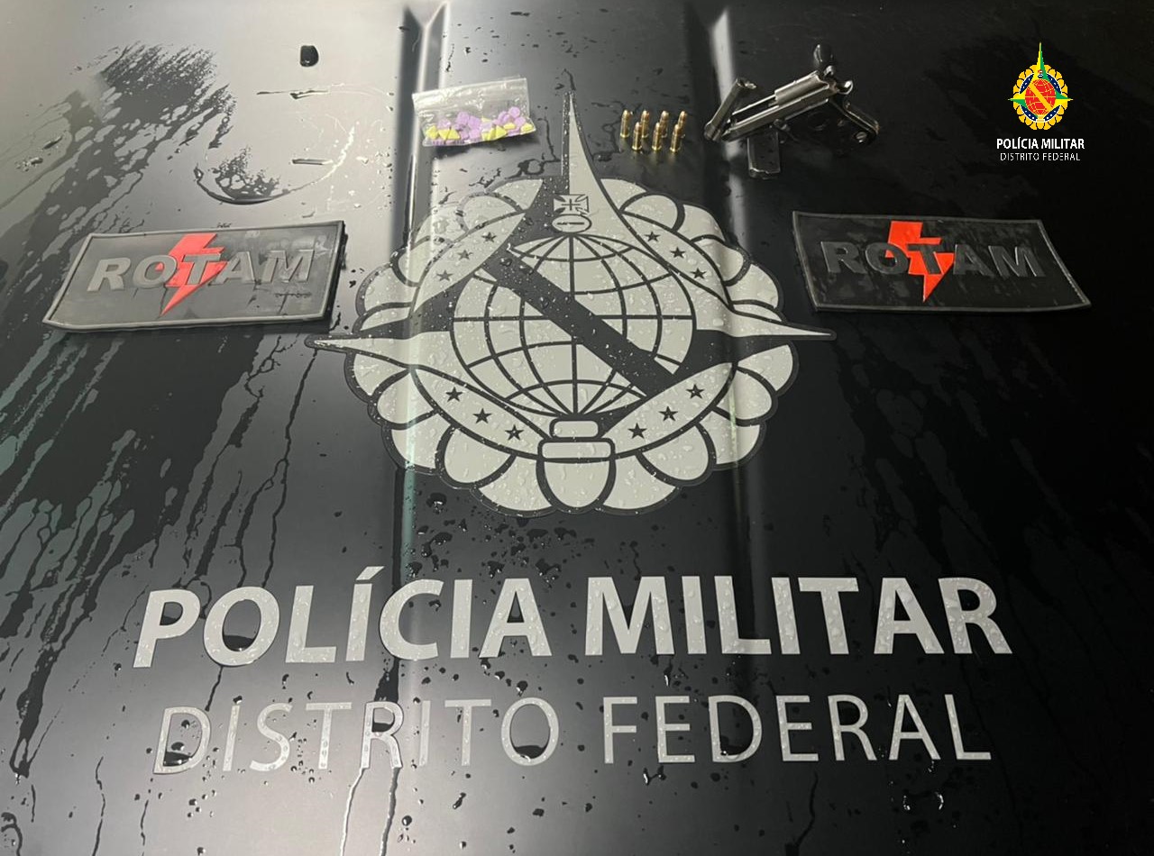 Policiais militares prenderam um homem por porte ilegal de arma de fogo e drogas nesta terça-feira (8), por volta das 21h, em Samambaia,