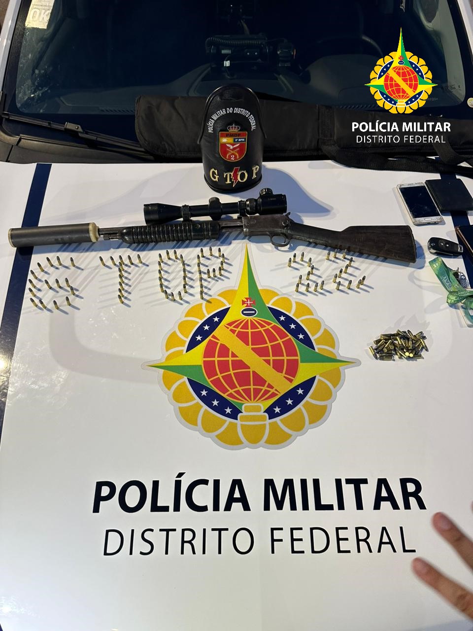 Os policiais do Grupo Tático Operacional do 2º Batalhão (GTOP-22) localizaram uma arma de fogo calibre 22 modificada com silenciador e mira telescópica, além de 112 munições intactas deste calibre, dentro do veículo dos suspeitos.