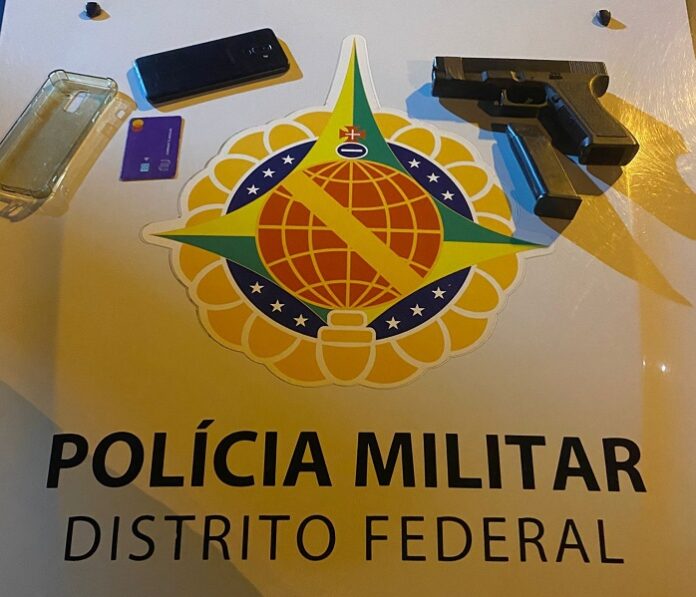 Policiais militares patrulhavam a C7 em Taguatinga centro quando viram um homem em atitude suspeita. Quando os militares se aproximara, o homem saiu correndo. Iniciou-se um acompanhamento e durante a fuga o homem se livrou de um celular e de um simulacro de arma de fogo. Pouco a frente, o suspeito acabou sendo abordado.