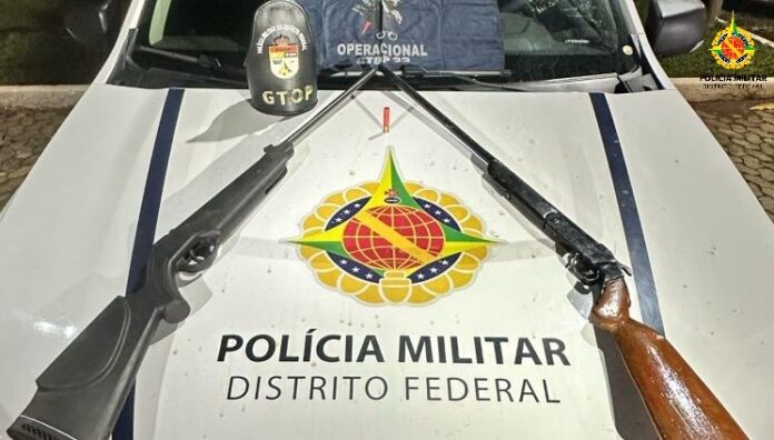 A equipe foi acionada para uma ocorrência de disparo de arma de fogo. Chegando ao endereço, os militares entrevistaram um homem que relatou ser proprietário de duas espingardas, sendo uma de fabricação caseira, calibre .36 com um cartucho intacto e uma carabina de ar comprimido, calibre 5.5.