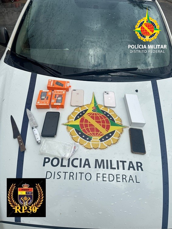 Uma equipe PMDF realizava o patrulhamento quando recebeu um acionamento do Centro de Operações para averiguar uma ocorrência de roubo, no local a guarnição foi informada pela vítima que ela foi surpreendida por dois indivíduos em um GM/CLASSIC, que os ocupantes do veículo portavam facas e anunciaram o roubo, tendo sido subtraídos dois iphones, um apple watch, e o celular pessoal do entregador, tendo eles se evadido sentido sol nascente trecho 3.