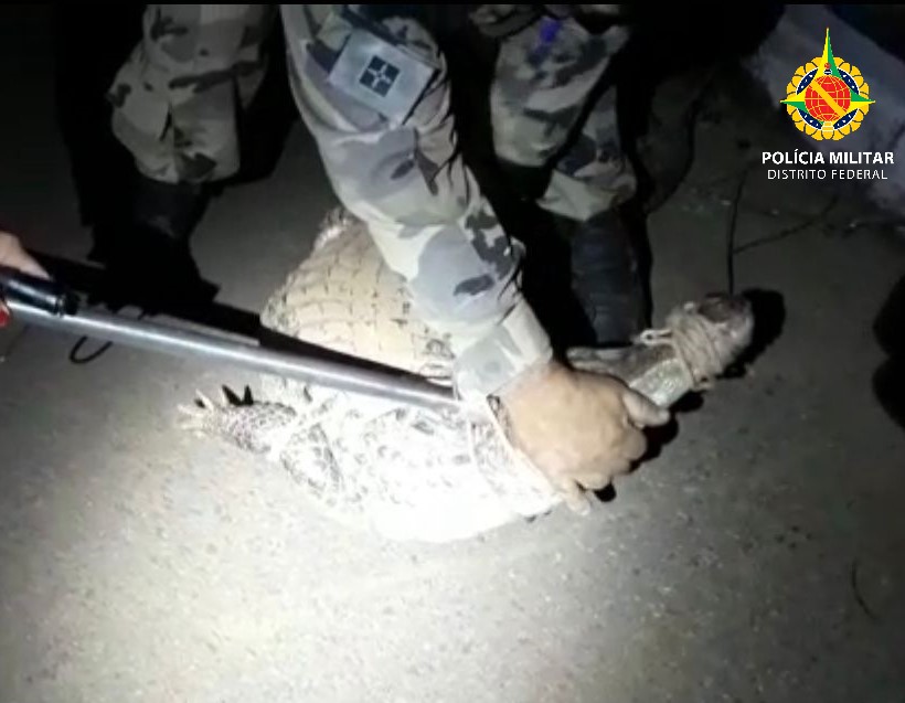 Policiais militares do Batalhão de Polícia Militar Ambiental (BPMA) resgataram um jacaré que estava andando na BR 070, no fim da tarde desta terça-feira (19). A equipe ambiental localizou o animal de 1,5m que estava com um comportamento agressivo.