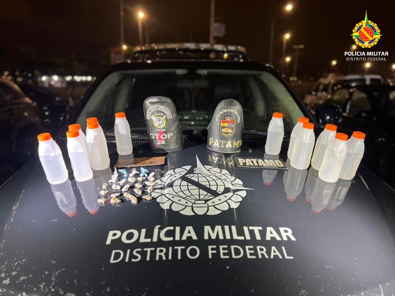 Durante o cerco policial, as equipes da PMDF apreenderam cinco litros de lança-perfume, sete porções de cocaína e 18 de maconha. O jovem assumiu a propriedade da droga e foi conduzido para a DCA 2.