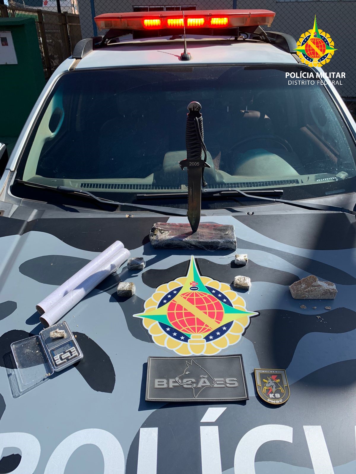 Os cães Shadow, Scott e Dexter, localizaram 1kg de maconha, 5 porções menores da mesma substância e 1 pedra de substância amarelada, similar a Crack, pesando aproximadamente 130g.