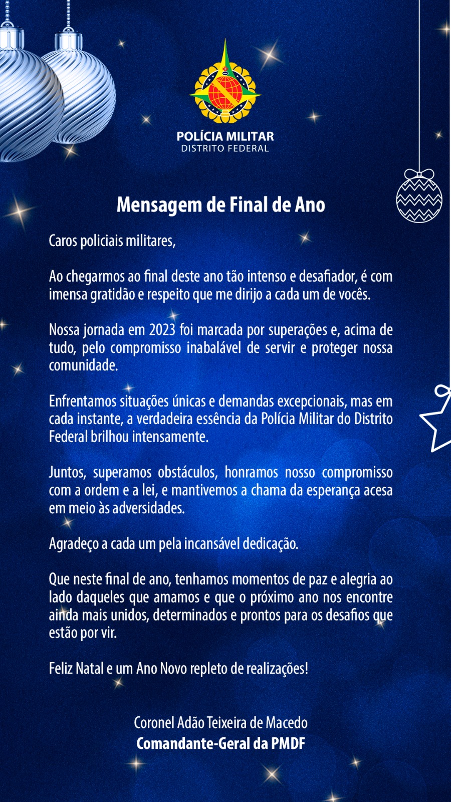 O comandante Geral da PMDF, Coronel Adão Teixeira de Macedo, deseja a todos um Feliz Natal e Prospero Ano Novo.