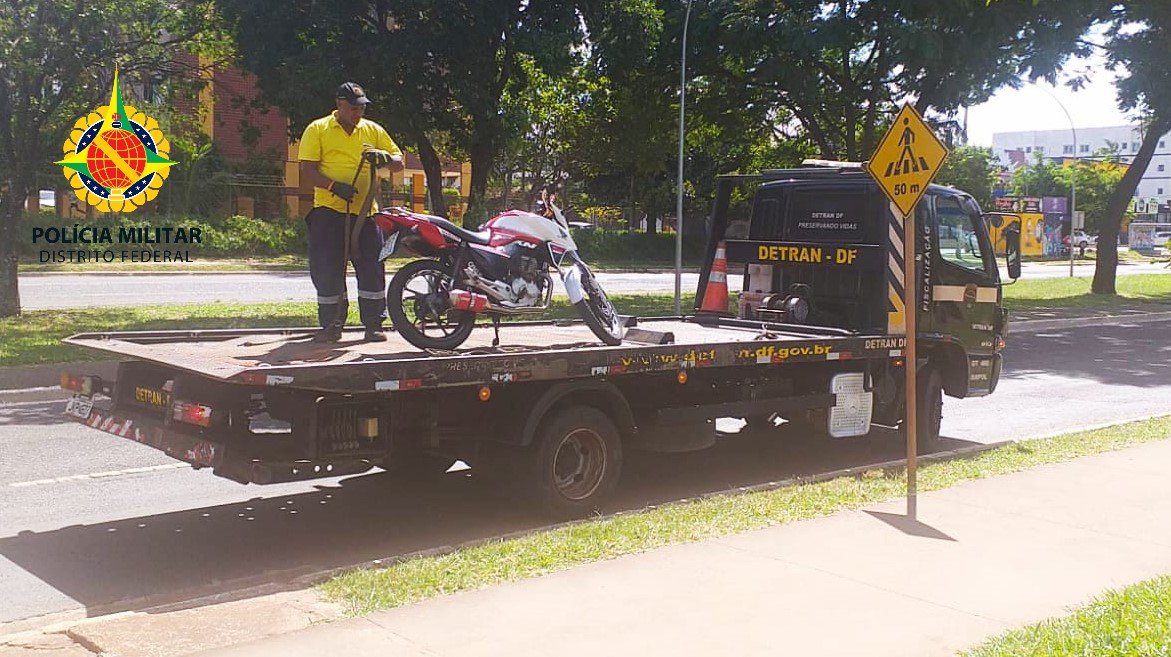 Policiais militares do Motopatrulhamento 22 do 2º Batalhão apreenderam uma motocicleta com mais de R$ 13 mil em multas após abordagem na QNL 5 de Taguatinga, às 13h30 deste domingo (03).