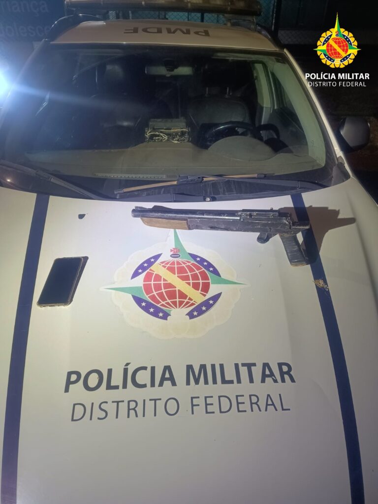 Na Cidade Estrutural, por volta das 21h30, a equipe policial patrulhava o Setor Norte quando avistou um indivíduo de bicicleta com uma mochila. Ao tentar fugir, o indivíduo foi alcançado e abordado. Dentro da mochila, foi encontrada uma arma de fogo calibre 12. O adolescente, com passagem anterior por porte ilegal de arma, foi apreendido novamente e encaminhado à 2ª Delegacia da Criança e do Adolescente.