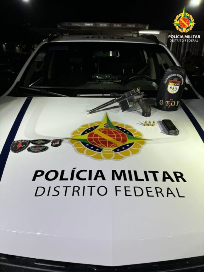 Os policiais militares do Grupo Tático Operacional do 20º Batalhão (Gtop 40) prenderam dois homens portando uma pistola automática nesta sexta-feira (23), por volta das 21h30, no Paranoá.