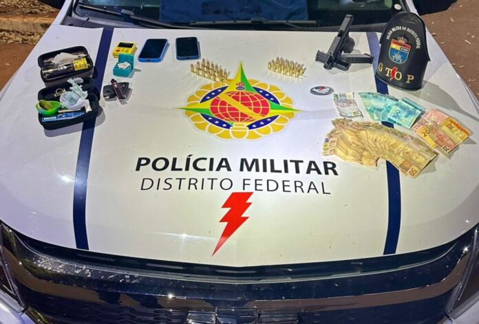 Por volta das 19h deste sábado (24), policiais militares do Grupo Tático Operacional do 5º Batalhão (Gtop 25) apreenderam uma arma de fogo, dinheiro e porções de entorpecentes na via L4 Sul. Na ação, dois homens foram detidos.