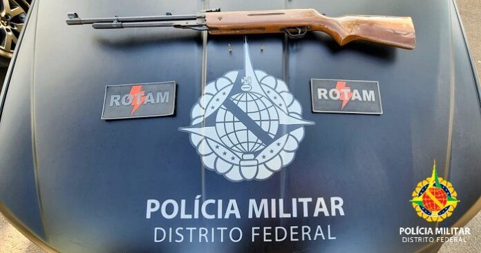 Os militares passaram a patrulhar as imediações e logo viram um veículo com as mesmas características passadas. Na revista veicular foi encontrada uma espingarda calibre 22 com uma munição intacta e um cartucho deflagrado. O abordado foi encaminhado à delegacia para registro da ocorrência.