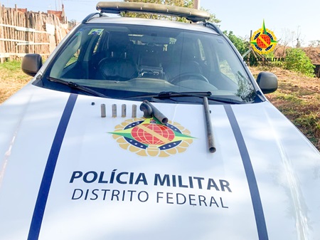 A equipe foi acionada pelo COPOM para verificar uma situação de violência doméstica envolvendo uma arma. Ao chegar no local, os policiais realizaram uma varredura e encontraram uma arma de fogo caseira, calibre 12, acompanhada de quatro munições não deflagradas, que estava sendo utilizada para ameaçar a vítima.