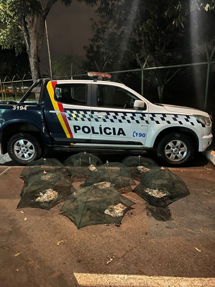 Os policiais militares patrulhavam a região, quando se depararam com os dois homens preparando material para captura de crustáceos e pequenos peixes.