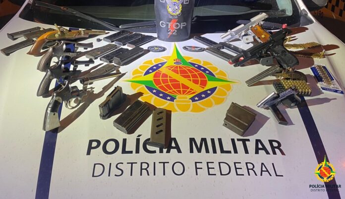 Policiais militares do Grupo Tático Operacional do 2º Batalhão (Gtop 22) apreenderam um arsenal em um comércio em Vicente Pires, por volta das 18h desta quarta-feira (13).