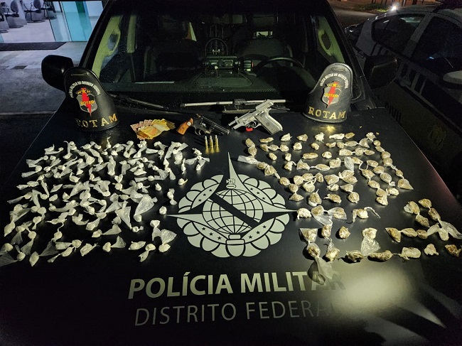 Policiais militares da Rotam apreenderam uma grande quantidade de entorpecentes e duas armas de fogo por volta das 21h30 desta segunda-feira (27) no Setor Habitacional Sol Nascente. Durante a ação, um usuário de entorpecentes foi detido.