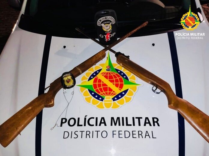 Policiais militares integrantes do Grupo Tático Operacional 33 (13º BPM – Sobradinho), apreenderam uma espingarda calibre 28, outra espingarda calibre 22 e uma munição calibre 22. O fato ocorreu por volta de 18 horas de hoje, 31 de março, no acampamento José Wilker, no Polo de Cinema (Sobradinho).