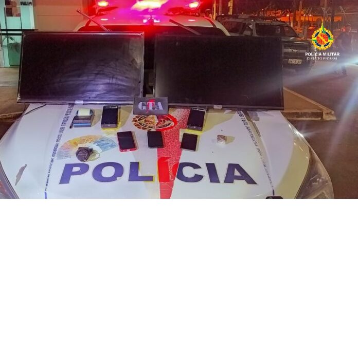 Chegando ao local, os policiais realizaram abordagens. Duas maquinas de bingo e uma porção de maconha foram encontradas.