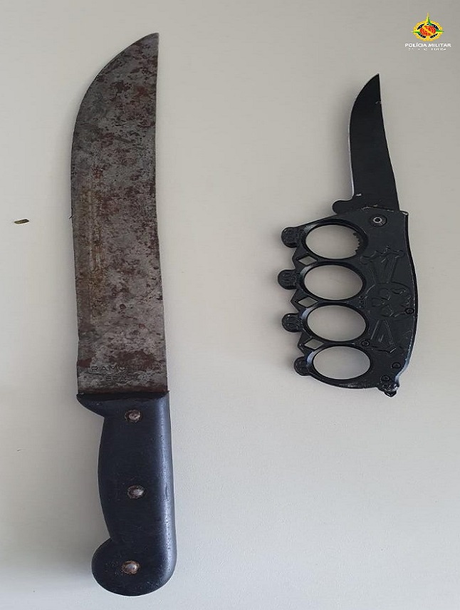 Quando próxima do local indicado, a guarnição se deparou com populares, que apontaram possíveis suspeitos de envolvimento na situação. Feita a abordagem, foram encontrados com os envolvidos um soco inglês canivete, além de um facão.