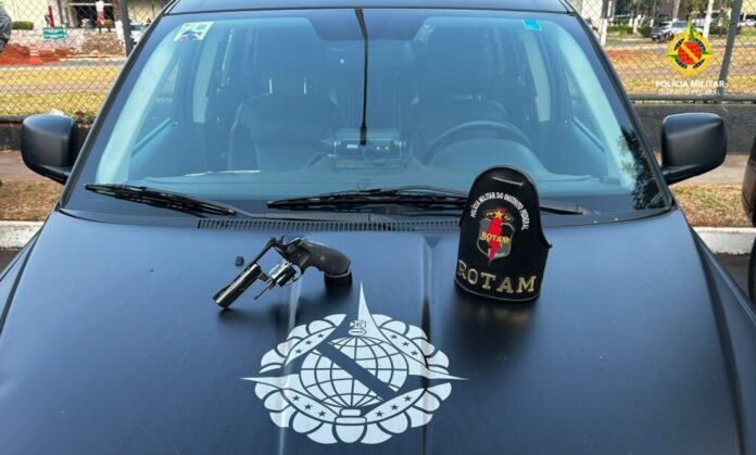 Policiais militares da Rotam apreenderam um revolver em um estacionamento na quadra 504 do Sudoeste, às 16h30 desta sexta-feira (27). A equipe da PMDF visualizou dois homens encostados em um carro, um deles dispensou no mato a chave do veículo assim que percebeu a presença dos policiais.