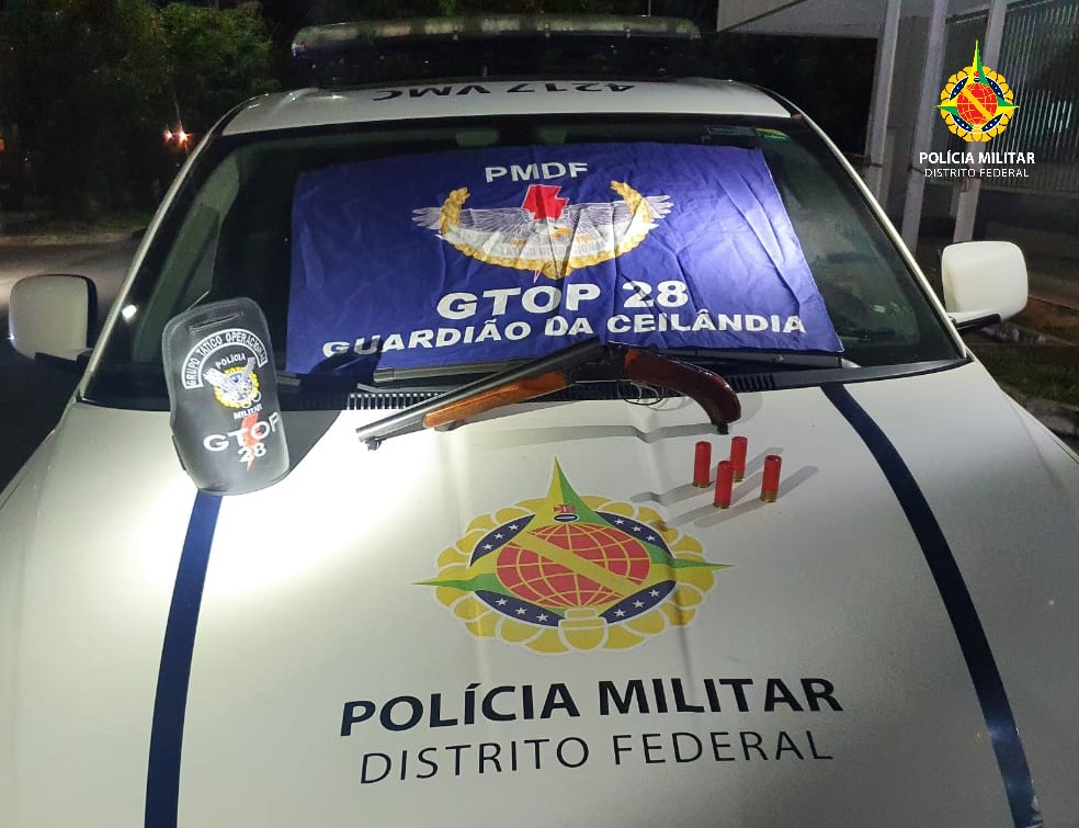 A equipe do Gtop 28 recebeu uma denúncia informando que um homem armado estaria no estacionamento de um supermercado na QNM 11. A equipe foi ao local viu um suspeito com as mesmas características da denúncia. Foi possível ver que ele estava com uma sacola com uma arma de fogo no interior. Ele foi abordado e uma espingarda calibre 12 com quatro munições foi apreendida. A ocorrência foi registrada na 15ª Delegacia.