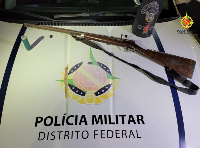 Os policiais encontraram uma espingarda e um recipiente com pólvora. O homem alegou que usava a arma para espantar os pombos do local. Ele foi conduzido à 20ª Delegacia para registro da ocorrência.