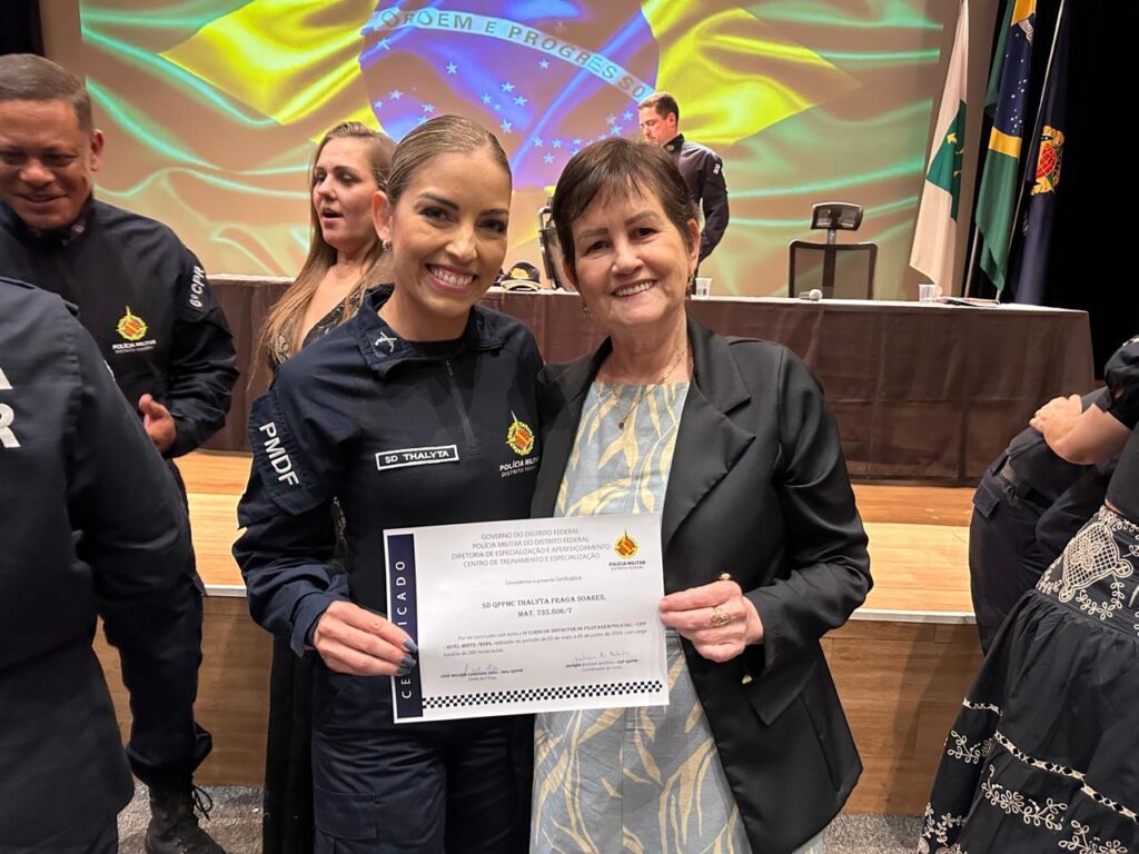 Um fato que marcou o CIPP 2024 foi a formatura da soldado Talita. Ela é a primeira policial militar feminina a se formar como Instrutora de Pilotagem Policial. A senhora Nara, mãe da soldado Talita, teve a honra de entregar o certificado de conclusão do curso à filha.