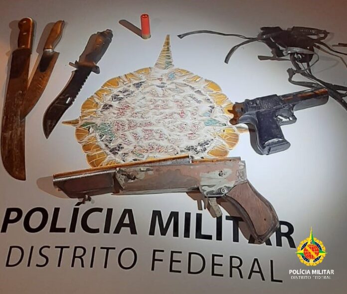Ao chegar ao referido condomínio, o solicitante franqueou a entrada. Durante a varredura do lote, a guarnição se deparou com três suspeitos, os quais jogaram duas facas e uma arma de fabricação caseira municiada com uma munição calibre 12.
