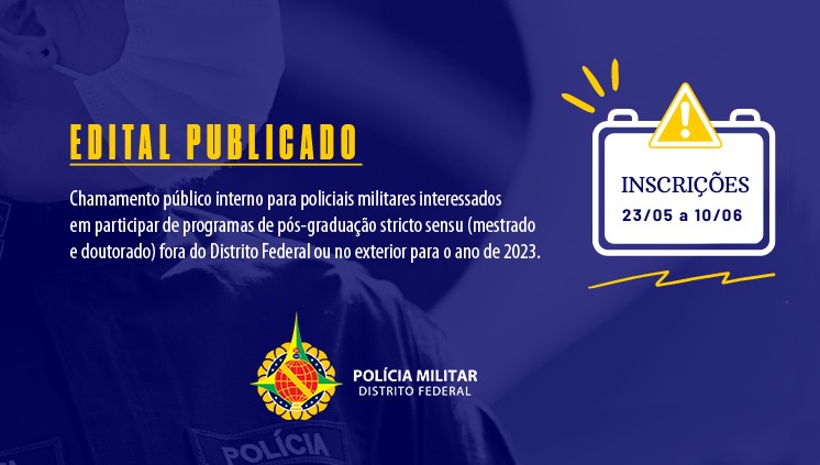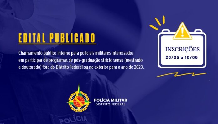 A Polícia Militar do Distrito Federal torna público o edital de chamamento público interno para policiais militares interessados em participar de programas de pós-graduação stricto sensu (mestrado e doutorado) fora do Distrito Federal ou no exterior para o ano de 2023.