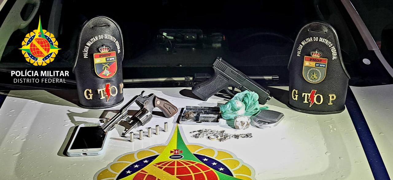 Com o apoio do Gtop 29, o Gtop 46 se dirigiu à residência indicada e localizou os suspeitos. Durante a busca no local, os policiais encontraram um revólver calibre 32 com cinco munições intactas, uma balança de precisão, porções de maconha, cocaína e um simulacro de pistola.